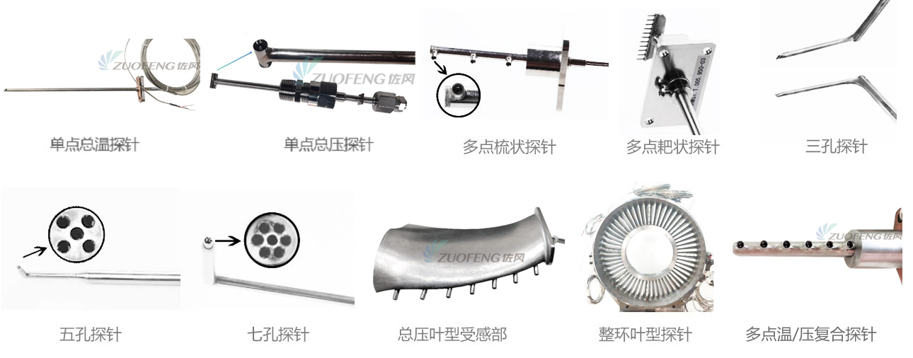 根据用户需求定制总温、总压、三孔、五孔、七孔探针,包括梳状及耙状探针,温压复合探针,叶型探针等各类气动测试探针设备。其中总压探针最大包容角±45°,总温探针最高测试温度1300℃,五孔探针最小头部直径1.0mm,偏转角/俯仰角测量范围不小于±40°,七孔探针最小头部直径1.5mm,测量角度范围不小于±60°。尖批状/锥形多孔探针最大工作马赫数可达2.0,同时公司可提供具备CNAS资质的探针标定服务。
